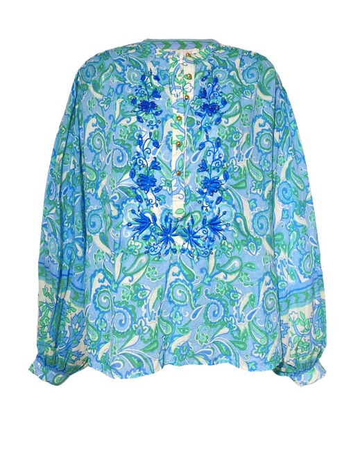 Fluffige Bluse in den Farben des Meeres.... Ballonarm lang. mit Stickereien und Applikationen.